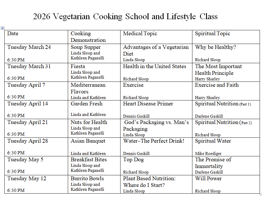 Besides cooking demonstrations, food samples and healthy recipes, this class also includes presentations on nutrition and health by health professionals as well as topics about spiritual health from the Bible.